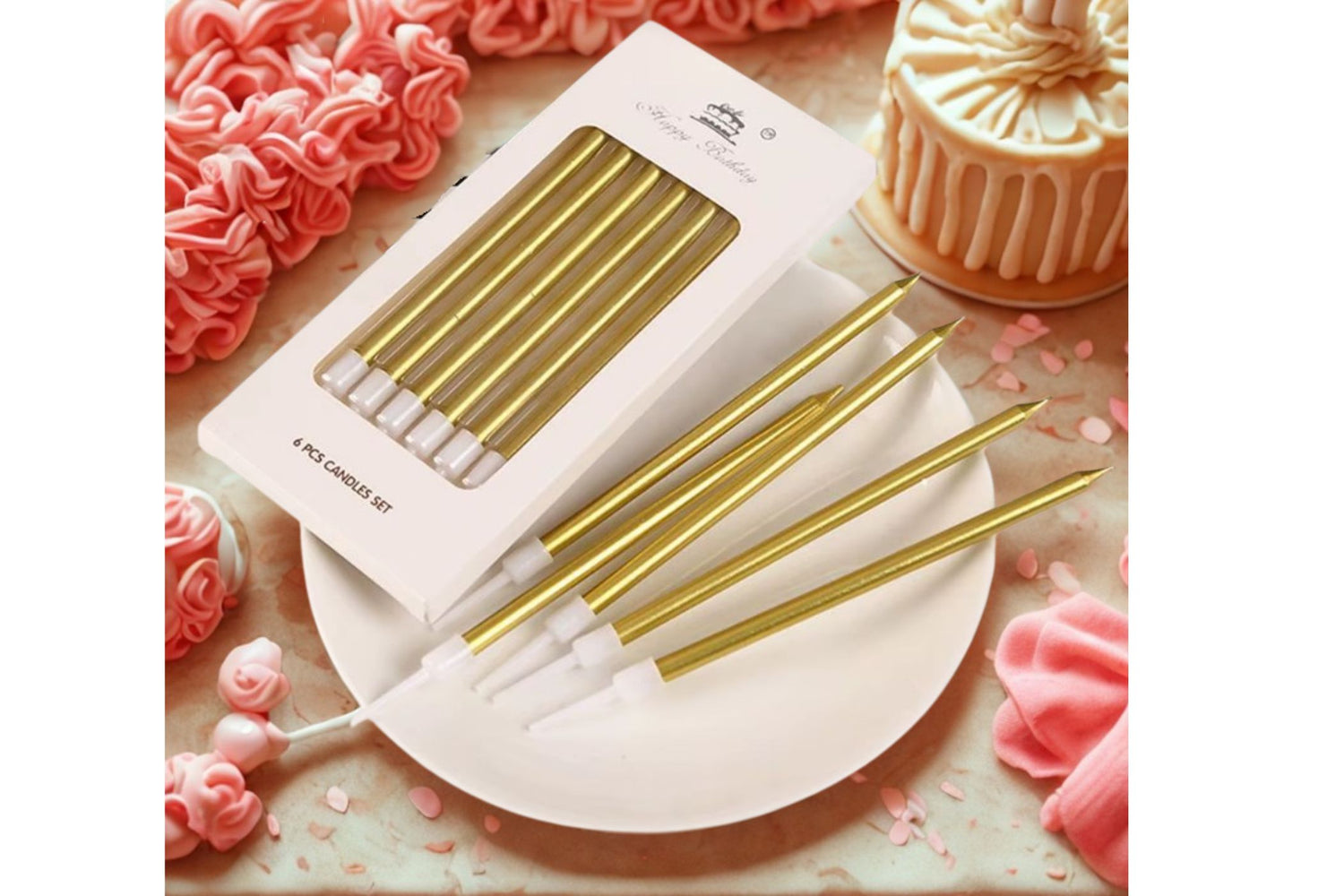 Finish off your cake order with these simple and elegant gold candles. Each set includes 6 candles with a sleek metallic finish—perfect for adding a clean, modern touch to any celebration. An easy add-on for birthdays or special moments.